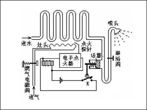 冷水進入熱水器,流經(jīng)水氣聯(lián)動閥體在流動水的一定壓力差值作用下,推動水氣聯(lián)動閥門,并推動微動開關(guān)將電源接通并啟動脈沖控制器,打開燃氣通氣電磁閥門,將燃氣熱水器燃燒器點燃;燃燒器點燃后,火焰檢測元件通過檢測火焰給出火焰信號予脈沖控制器,通過維持電流將電磁閥打開,維持燃燒器的正常燃燒。如果當點火失敗,脈沖點火器因無檢測到火焰的維持電流信號,無法維持電磁閥的正常開啟,關(guān)閉電磁閥,切斷燃氣的供應(yīng)。