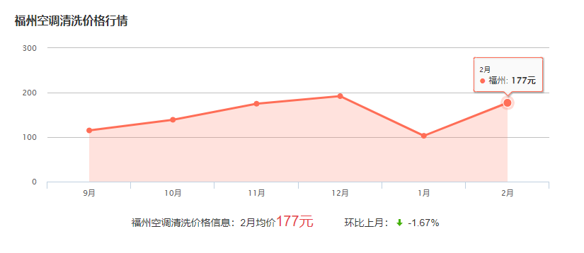 福州空調(diào)清洗的費用一般在60-200元左右,不同類型和型號的空調(diào)清洗費用不同,因此如要了解具體的空調(diào)的價格可來電咨詢!下面為近幾個月清洗空調(diào)的幾個波動圖,僅供參考:
