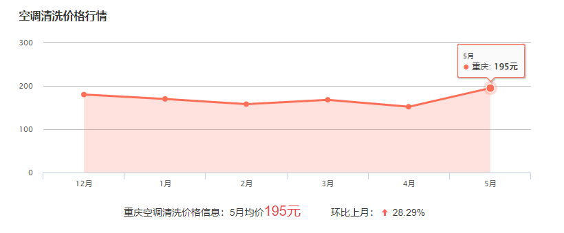 重慶清洗空調(diào)一臺(tái)的費(fèi)用在60-300元不等,不同類型和規(guī)格的空調(diào)的清洗費(fèi)用有所不同,具體價(jià)格需要師傅根據(jù)具體情況報(bào)價(jià)!下面為重慶近幾個(gè)清洗空調(diào)費(fèi)用波動(dòng)圖,僅供參考: