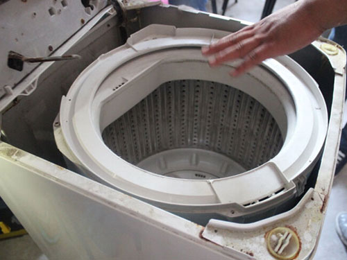 3、如果電機(jī)有轉(zhuǎn),皮帶也沒脫落,桶還是不轉(zhuǎn),那就有可能是桶沿卡到衣服或雜物了,或者是離合器/三角架有異物卡住了。