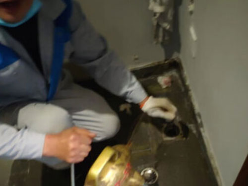 7.準(zhǔn)備一根直徑比排水口略小一點的圓木,然后在水池中放一些水,將圓木插在水管口迅速上下抽動,運用壓力和吸力的作用將管道里的堵塞物沖走。