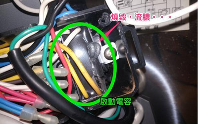 4.準(zhǔn)備拆下壞的啟動電容;在此之前可以先拍下電容器的spec,避免不小心拆的過程把字磨掉;查看后發(fā)現(xiàn)燒毀很嚴(yán)重,粘死在控制盒;只好把整個控制盒拆下來,比較好使力取下電容器;出動魚口鉗,硬把他夾出來了;做個記錄,spec是4uF/250v,二合一,燒毀溶出個大洞,超級臭,量尺寸,準(zhǔn)備買零件,長47mm,寬20慢慢,高30mm;