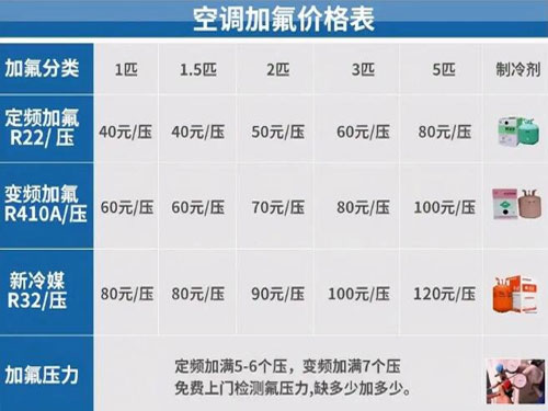 廈門(mén)空調(diào)加氟收費(fèi)標(biāo)準(zhǔn):35元/壓力起,具體加幾個(gè)壓力由師傅用儀器檢測(cè)